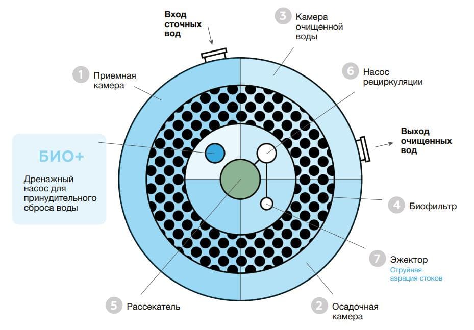 Также в биофильтре происходит механическое насыщение очищаемой воды кислородом воздуха, что позволяет дополнительно повысить степень распада органических веществ в первой секции, куда осуществляется сброс после прохождения воды через технологическую ступень.