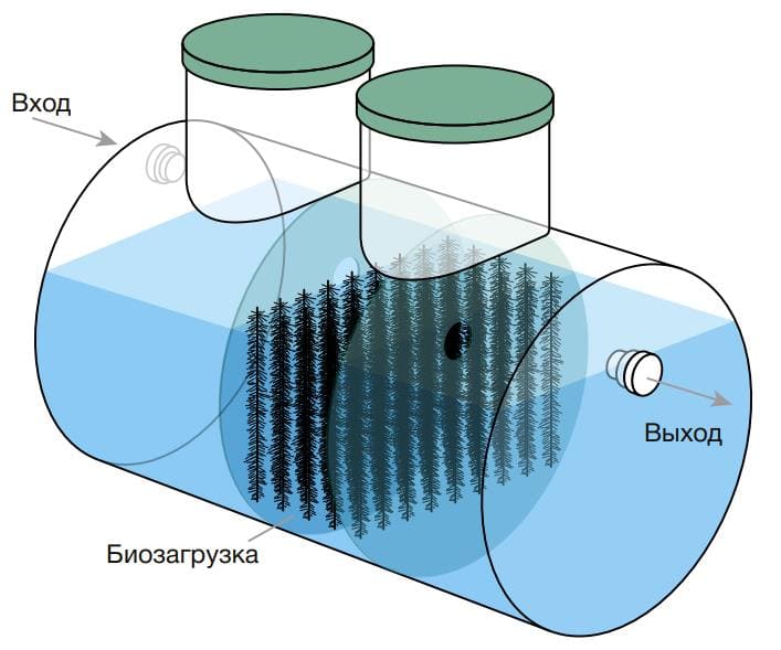 В септиках проточного типа очищение стоков происходит за счет анаэробных бактерий. После предварительного осветления стоков, вода из Септика должна направляться в дренажный элемент, на аэрационное поле или фильтрационнцю траншею, где стоки проходят дополнительную очистку грунтом.