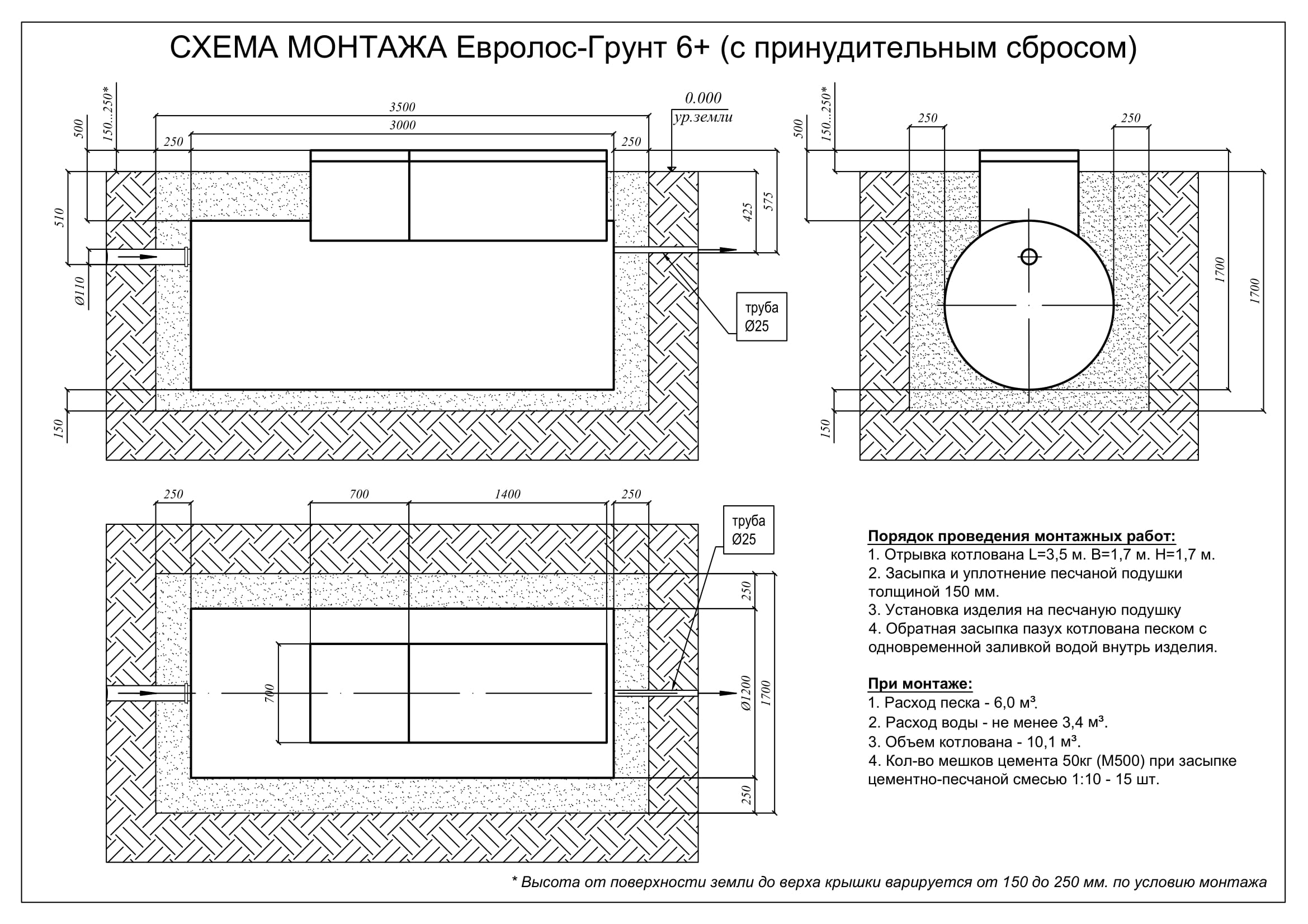 Евролос ГРУНТ 6+ – это септик со встроенным насосом, который обеспечивает принудительный отвод чистой воды в точку сброса. Этот процесс является полностью автоматическим, отвод воды осуществляется в канаву, дренажный элемент или колодец. Применение данной модели рекомендуется в регионах с уровнем грунтовых вод выше нормы и при условии, что глубина врезки канализационной трубы до 150 см.