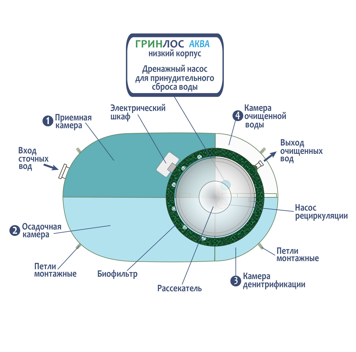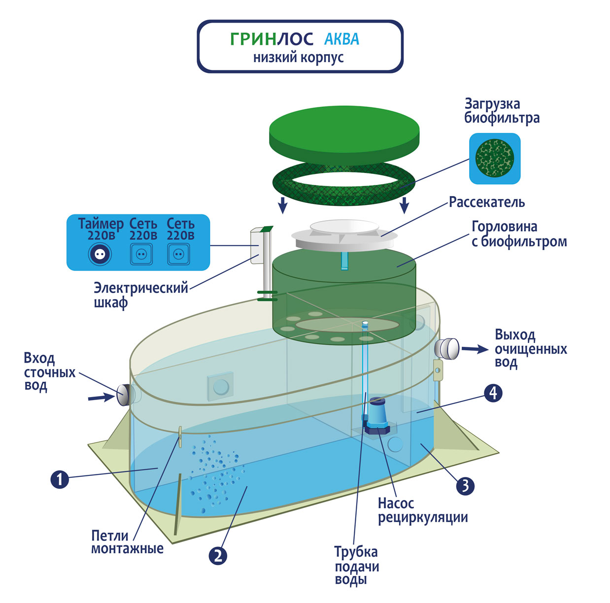 ГРИНЛОС Аква 3 низкий корпус – это септик с низким корпусом высотой всего м. Высота корпуса позволяет монтировать септик в сложных условиях грунта, высокий уровень грунтовых вод, плывуны, торфяной, скальный грунт и т. Д.
