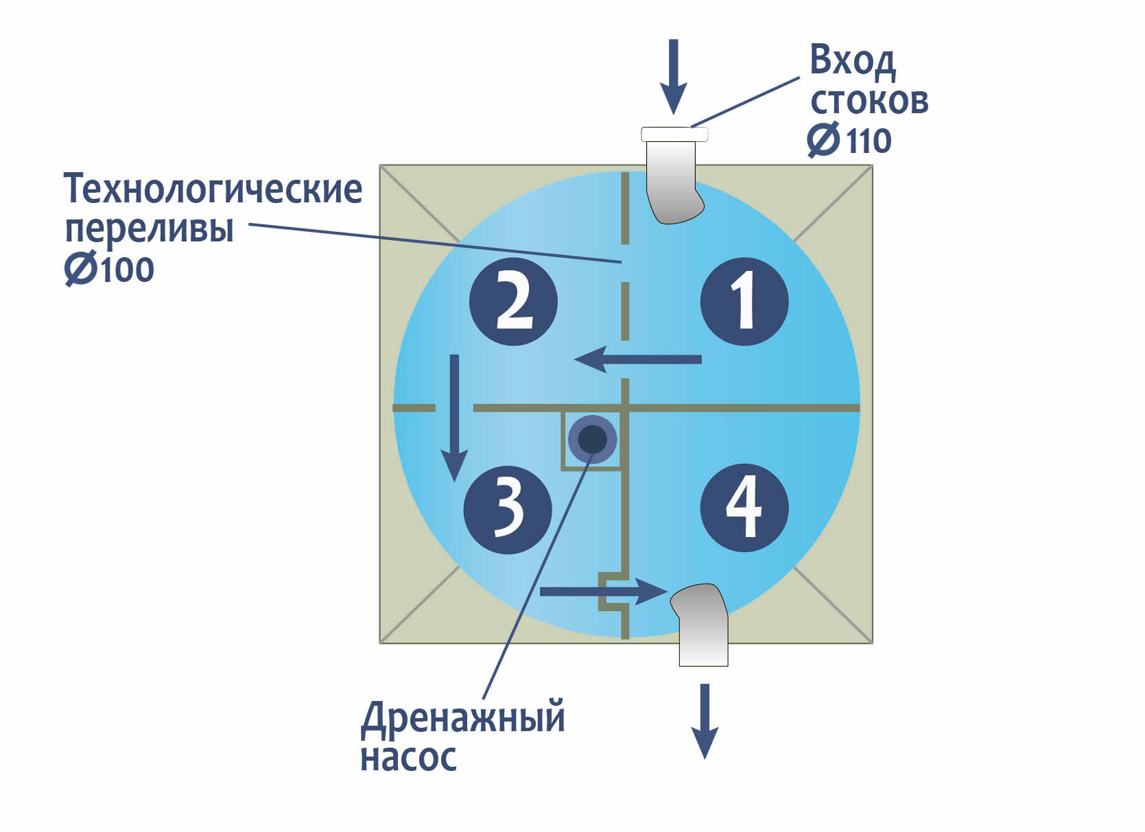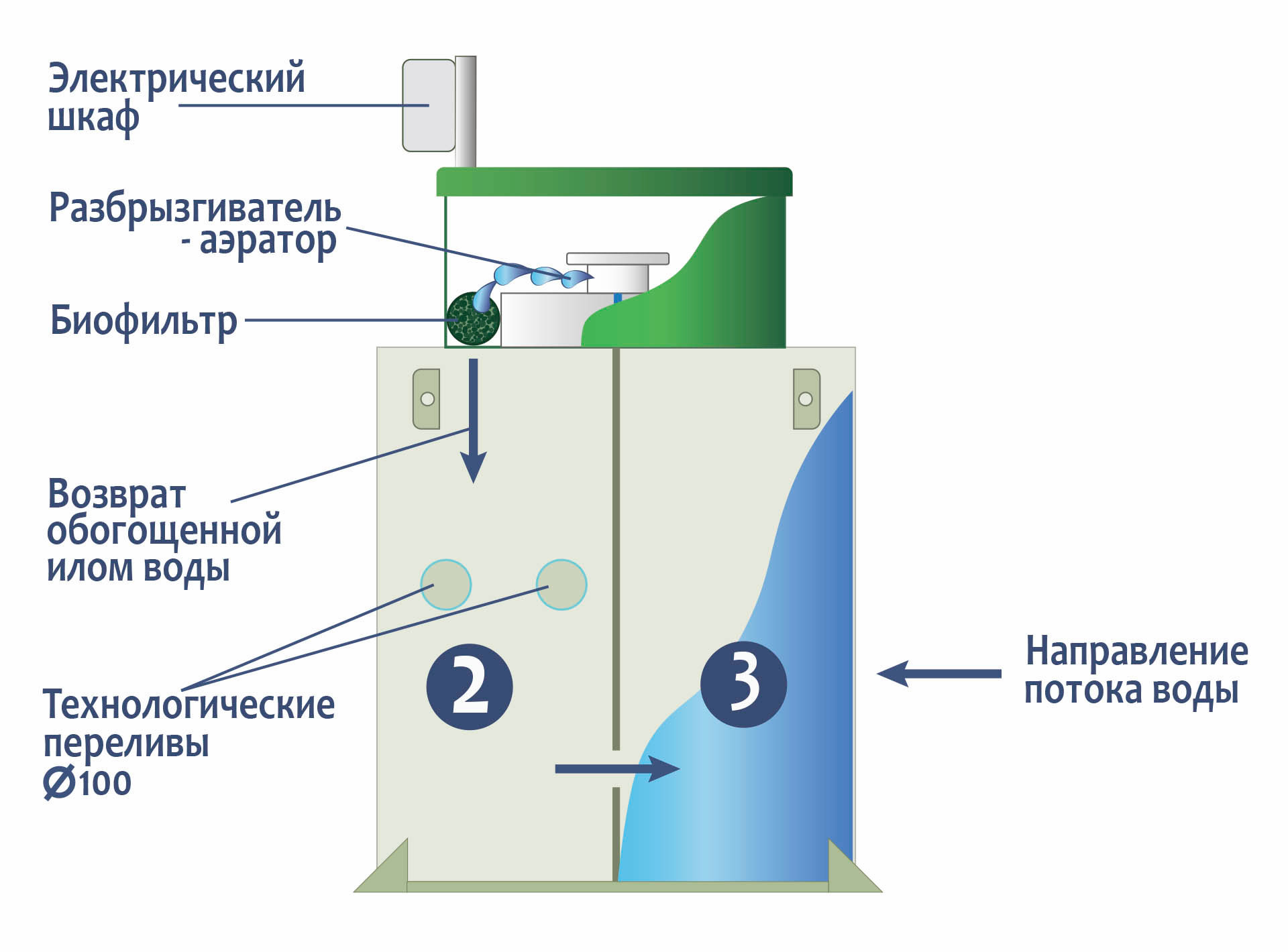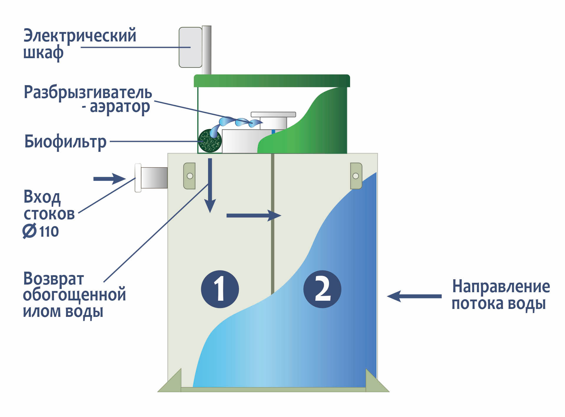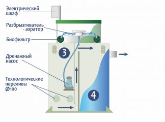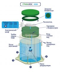 Станции биологической очистки ГРИНЛОС Аква 5 предназначены для расщепления и переработки основных органических загрязнений, содержащихся в бытовых сточных водах. Эти процессы происходят в результате жизнедеятельности аэробных микроорганизмов. Естественный природный процесс в септике оптимизирован путем физического разделения стоков, аэрацией и установкой биофильтра (специального устройства, на котором образуется биопленка из микроорганизмов). Благодаря использованию двух видов ила – свободного и фиксированного, достигается более высокая степень очистки, удлиняется временной интервал планового обслуживания. Создание этих условий требует обособленности процессов, разделения стоков по изолированным камерам и их последовательного перетекания. Изделие ГРИНЛОС Аква 3 сконструировано таким образом, что все камеры, в которых происходит отстаивание, аэрация, разделение и осветление стоков объединены в одном корпусе цилиндрической или овальной формы.