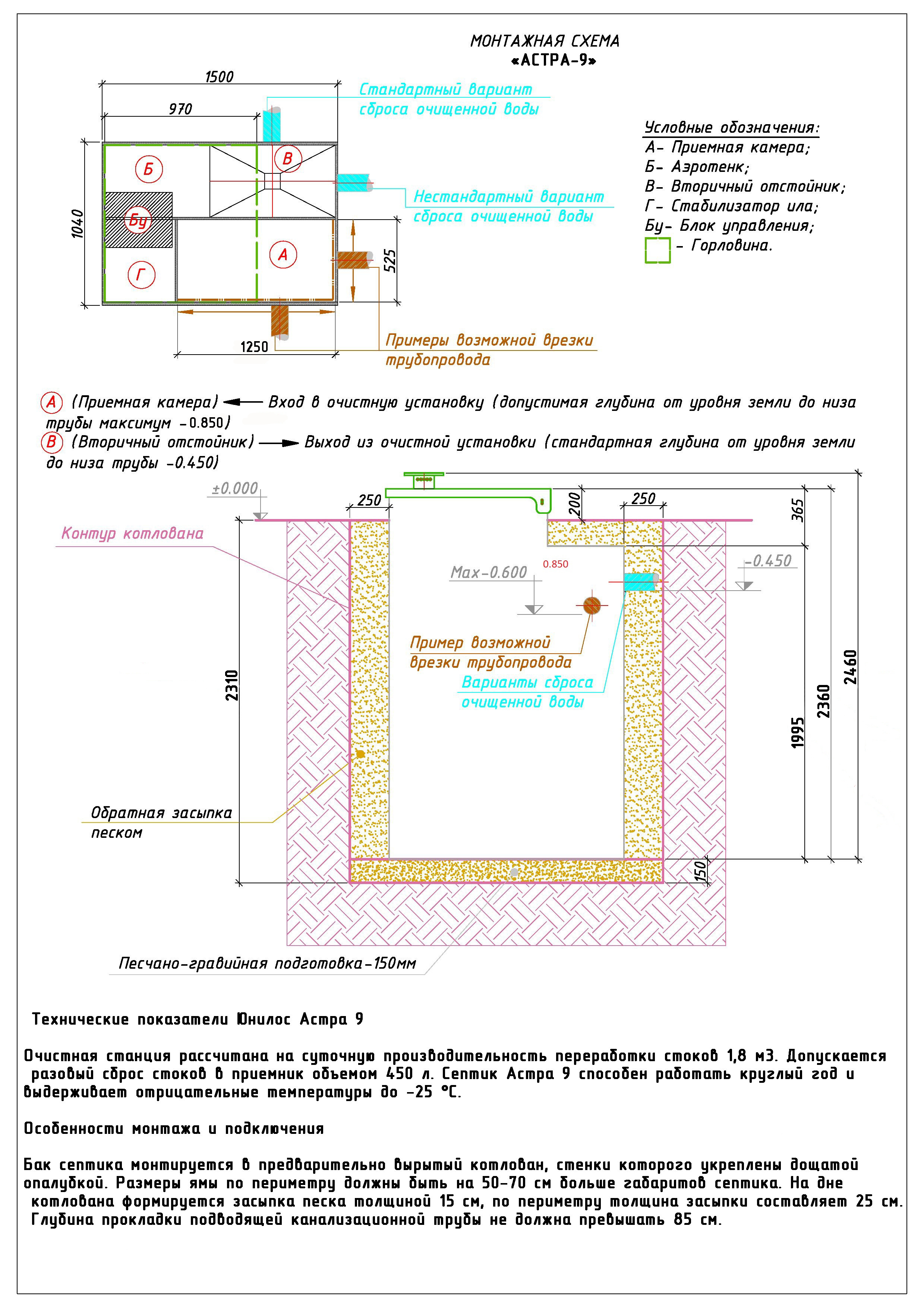 Септик Юнилос Астра 9 может быть реализована как с самотечным отводом очищенных стоков, так и с принудительным.